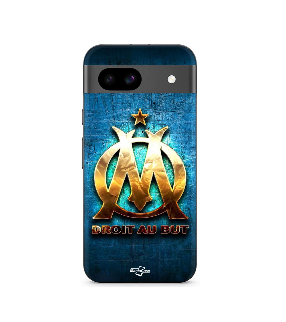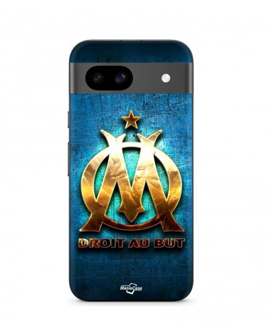Coque Google Pixel 8a OM dorée brilant droit au but fond bleu