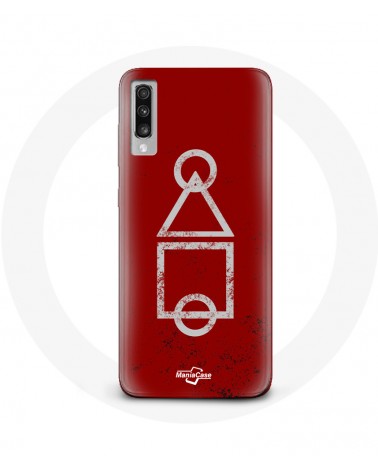 Coque pour Samsung Galaxy A70 Squid Game logo symboles cercle carre triangle Fond Rouge
