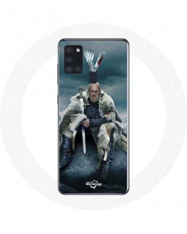 Coque pour Samsung Galaxy A21S Vikings Série Saison 6 Ragnar Lothbrok logo V Epée Gris Fond Brouillard