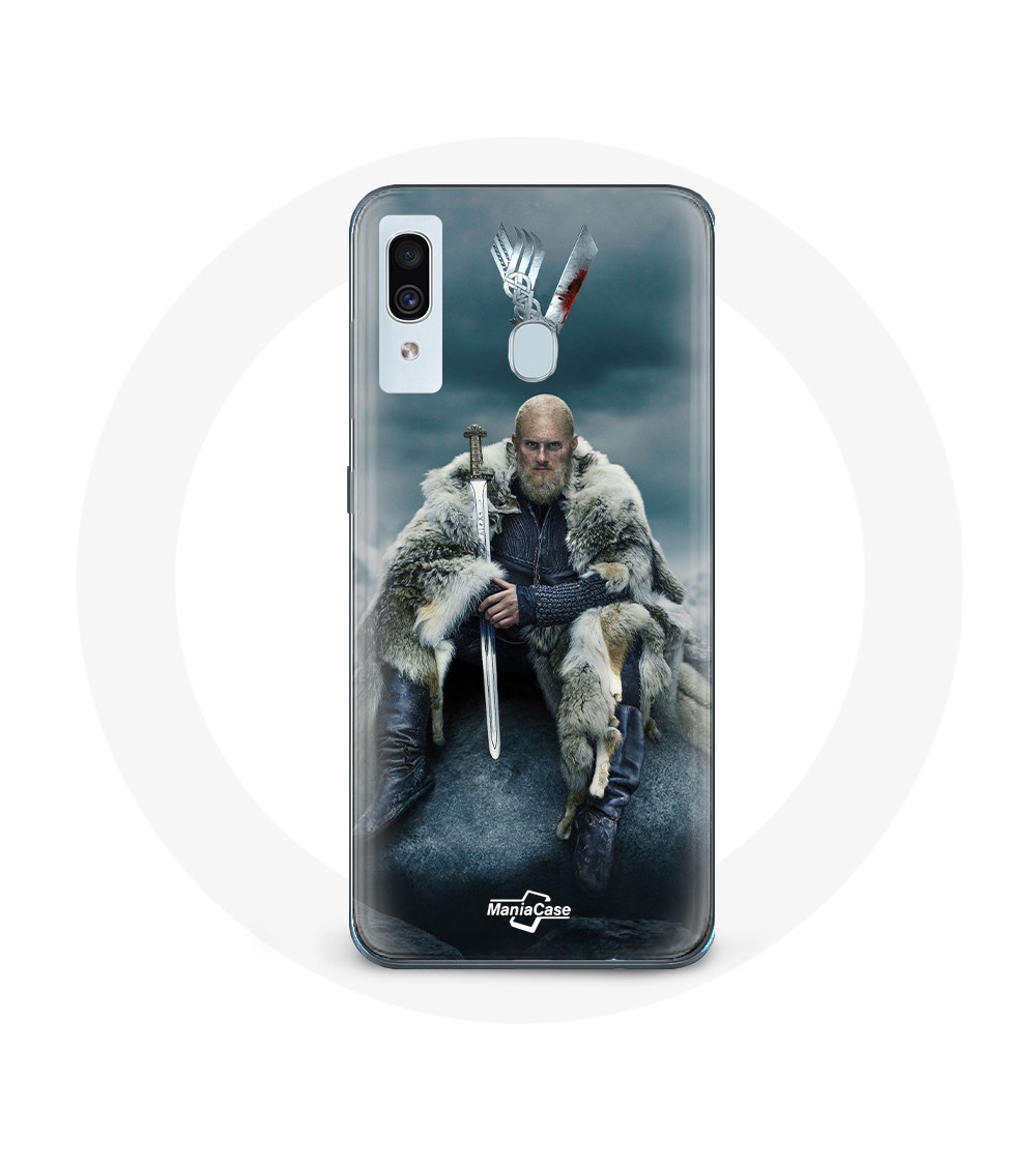 Coque pour Samsung Galaxy A20 Vikings Série Saison 6 Ragnar Lothbrok logo V Epée Gris Fond Brouillard